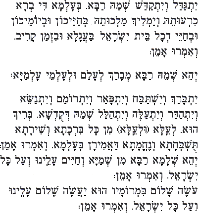 Yit-gadal v’yit-kadash sh’may raba b’alma dee-v’ra che-ru-tay, ve’yam-lich mal-chutay b’chai-yay-chon uv’yo-may-chon uv-cha-yay d’chol beit Yisrael, ba-agala u’vitze-man ka-riv, ve’imru amen.